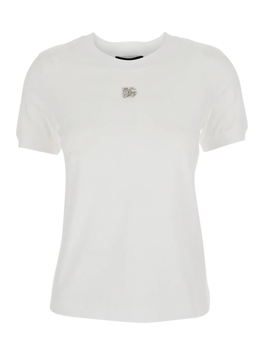Dolce & Gabbana T-shirt with application. Logo plaque, silver-tone details, round neckline, short sleeves and straight hem. Material: Cotton. Color: White. Origin: Italy Gender: Women Material: 100%COTTON Color: WHITE Made in: IT Product ID: F8N08ZG7B3UW0800 *Import tax/duty will be calculated at checkout (If applicable)