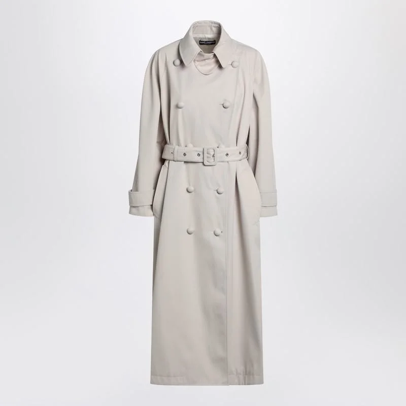Double-breasted trench coat by Dolce & Gabbana in beige cotton drill, featuring rounded lapels, long raglan sleeves with epaulettes, two side welt pockets, semi-lined design in silk satin, button closure, adjustable waist belt, and back vent. Gender: Women Material: Fabric I: 65% Polyester - 35% Cotton / Lining: 100% Silk Color: Beige Made in: Italy Product ID: F0W3STHUMVM/Q_DOLCE-M0299 *Import tax/duty will be calculated at checkout (If applicable)