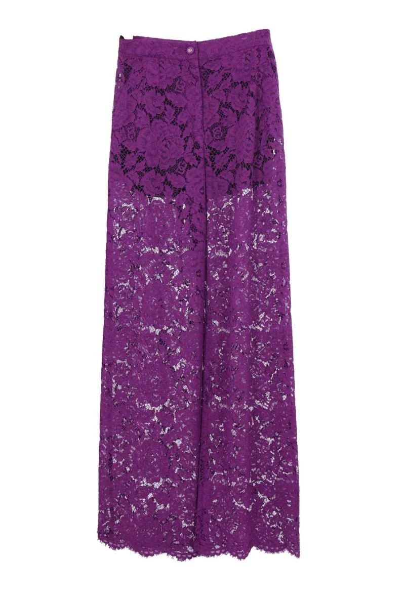 Dolce & Gabbana wide-leg trousers crafted from floral cordonetto lace. Featuring button and zip closure, slanted side pockets, double pleats, and scalloped hem. The design is completed by an internal slip short in crepe de chine. Gender: Women Material: 35%COTTON+24%POLYAMIDE+41%VISCOSE Color: PURPLE Made in: Italy Product ID: FTCPTTHLM7LF0571 *Import tax/duty will be calculated at checkout (If applicable)