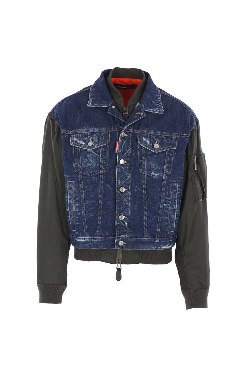 Dsquared2 padded bomber crafted from military green nylon and blue distressed cotton denim. Featuring a bomber collar, two-way zip closure, multiple pockets, long sleeves, ribbed knit trims, and quilted orange lining. Completed with an overlapping panel with pointed collar, metal buttons, adjustable waist tabs, and logo patch on the back. Gender: Men Material: 100% COTTON Color: BLUE Made in: Italy Product ID: S71AN0611D30011470 *Import tax/duty will be calculated at checkout (If applicable)