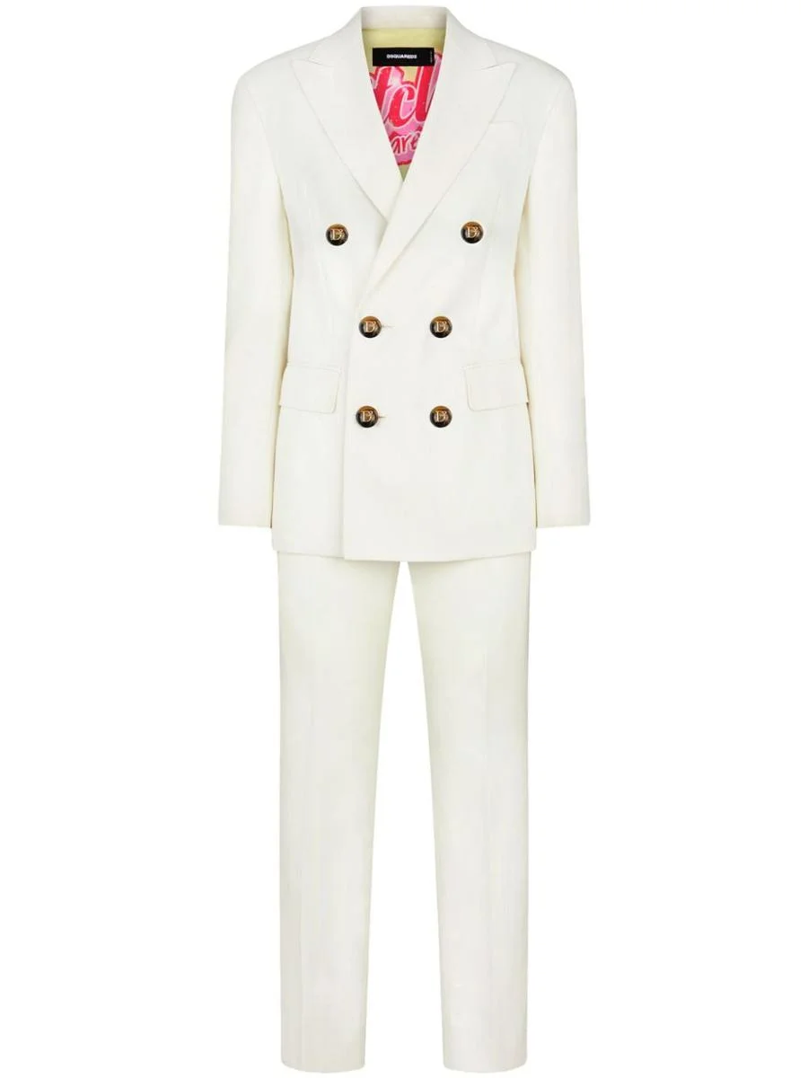 Highlights white tailored design Jacket : peak lapels double-breasted button fastening two front flap pockets shoulder pads two front flap pockets long sleeves Trousers : high-waisted belt loops two side slit pockets two rear button-fastening jetted pockets tapered leg straight hem Gender: Women Material: 55% POLYESTER 45% VIRGIN WOOL Color: WHITE Made in: Imported Product ID: S75FT0251S76498 101 WHITE *Import tax/duty will be calculated at checkout (If applicable)