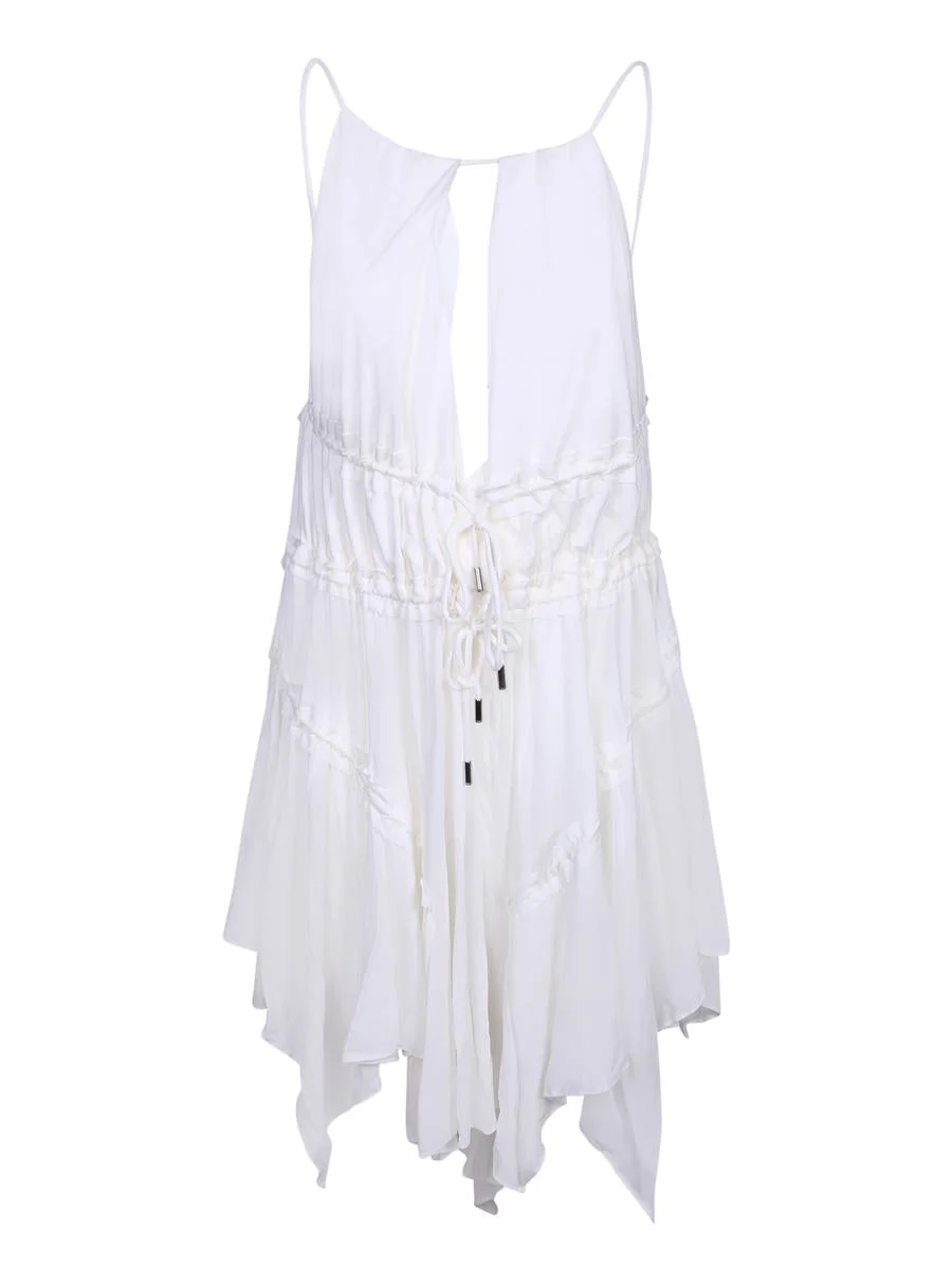 Deep V neckline. Adjustable waist drawstring. Ruffle trim.. This DSQUARED2 white jersey mini dress gracefully enhances feminine elegance with its deep V neckline and ruffle details. Perfect for outdoor summer events, it provides a fresh and airy silhouette with an adjustable drawstring that emphasizes the waist Gender: Women Material: 95% VISCOSE 5% ELASTANE Color: WHITE Made in: Imported Product ID: S72CV0692 S23324 101 *Import tax/duty will be calculated at checkout (If applicable)