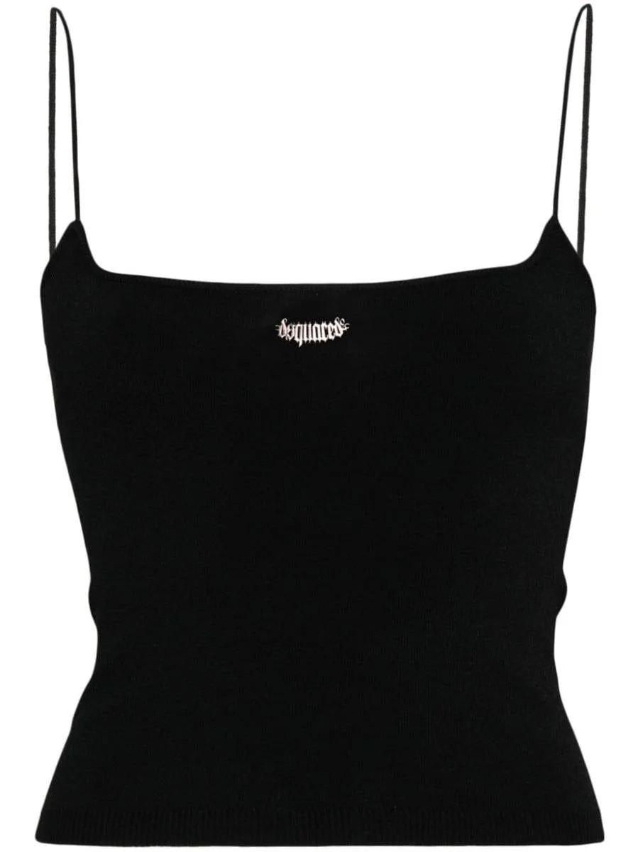 Highlights black fine knit spaghetti straps square neck silver-tone logo plaque square open back unlined ribbed hem cropped Gender: Women Material: 83% VISCOSE 17% POLYESTER Color: Black Made in: Imported Product ID: S75HA1263S18435 900 BLACK *Import tax/duty will be calculated at checkout (If applicable)