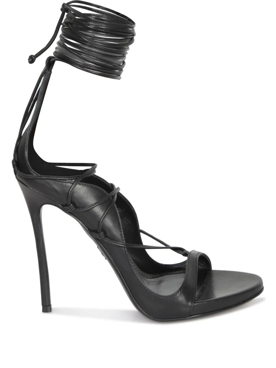 Black leather sandals with a wrap-around design. Features a tapered high heel and details of intertwined straps.. Designed with sophistication by DSQUARED2, these black sandals embody contemporary elegance. The unique crossed strap design highlights the foot with a bold and stylish touch Gender: Women Material: 100% LAMB Color: Black Made in: Imported Product ID: HSW0258 18900001 2124 *Import tax/duty will be calculated at checkout (If applicable)