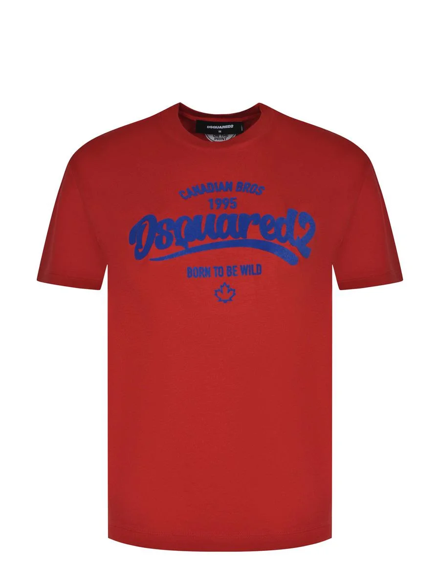 Dsquared2 T-shirt made of red cotton. Ribbed crew neck. Short sleeves. Contrasting velvet logo lettering on the chest. Gender: Women Material: COTTON Color: RED Made in: Italy Product ID: S75GD0488D20035-309 *Import tax/duty will be calculated at checkout (If applicable)