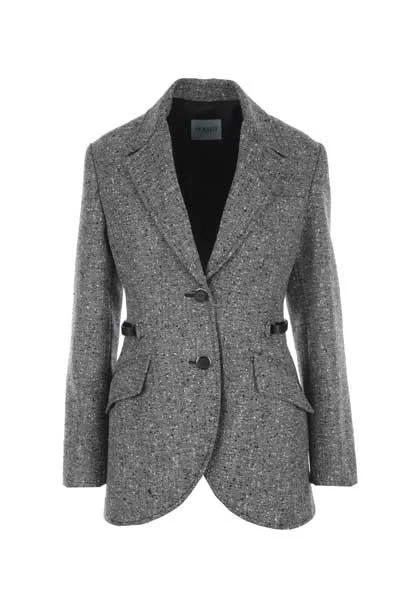 Durazzi Milano's single-breasted jacket crafted in melange grey wool blend. Featuring notch lapel, front button closure, long sleeves with buttoned cuffs, back / side belt, front flap pockets and back central vent. Lined interior. Gender: Women Material: - EXT. 96% VISCOSESCOSERGIN WOOLOL, 3% POLYAMIDE, 1% ELASTANE - MELTON 70% WOOL, 30%VISCOSESCOSE - LINING 100% VISCOSESCOSE - BELT 100% LAMB Color: GREY Made in: IT Product ID: C01GREYMELANGE *Import tax/duty will be calculated at checkout (If applicable)