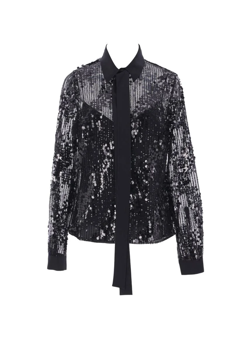 Elie Saab shirt crafted from black tulle with tone-on-tone silk trims and all-over sequins in various sizes. Featuring a pointed collar with a removable silk bow, concealed front button fastening, long sleeves with buttoned cuffs, a straight hem, and a coordinating silk camisole. Gender: Women Material: 52%POLYESTER 48%SILK Color: Black Made in: Imported Product ID: SH127NP25PA010BK001 *Import tax/duty will be calculated at checkout (If applicable)