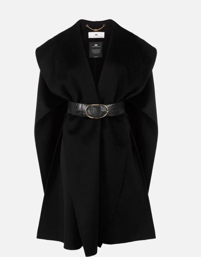 Unlined, oversized cape in double-faced wool. The enveloping volumes are defined by the wide, matching belt, featuring a crocodile-print texture that adds character, and a pin buckle with a gold-tone metal logo. Gender: Women Material: 100%WOOL Color: Black Made in: Imported Product ID: CP67D56E2110 Nero *Import tax/duty will be calculated at checkout (If applicable)
