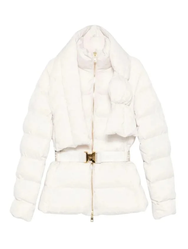 Regular-fit sail fabric down jacket. Featuring a removable padded scarf at the collar and invisible zip pockets. The all-over jacquard diamond pattern adds a luxurious touch. A belt with a buckle defines the waist. Gender: Women Material: 100%POLYESTER Color: Beige Made in: Imported Product ID: PI83D56E2DZ9 Milk *Import tax/duty will be calculated at checkout (If applicable)