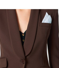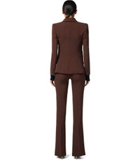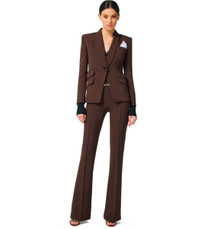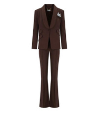 Elisabetta Franchi suit made of crepe in shades of brown. The single-breasted blazer features padded shoulders, a soft collar, three patch pockets on the front, and a chest pocket with a white cotton logoed handkerchief. Button closure. The trousers have a pressed crease on the front, flared hem, and a logoed waistband. The leg is slightly flared. Concealed zip closure. Slim fit. The model is 177 cm tall and is wearing size 40 IT. Composition: 95% polyester, 5% elastane. Gender: Women Material: TECHNICAL FABRIC Color: BROWN Made in: Italy Product ID: TP00156E2-EA3 *Import tax/duty will be calculated at checkout (If applicable)