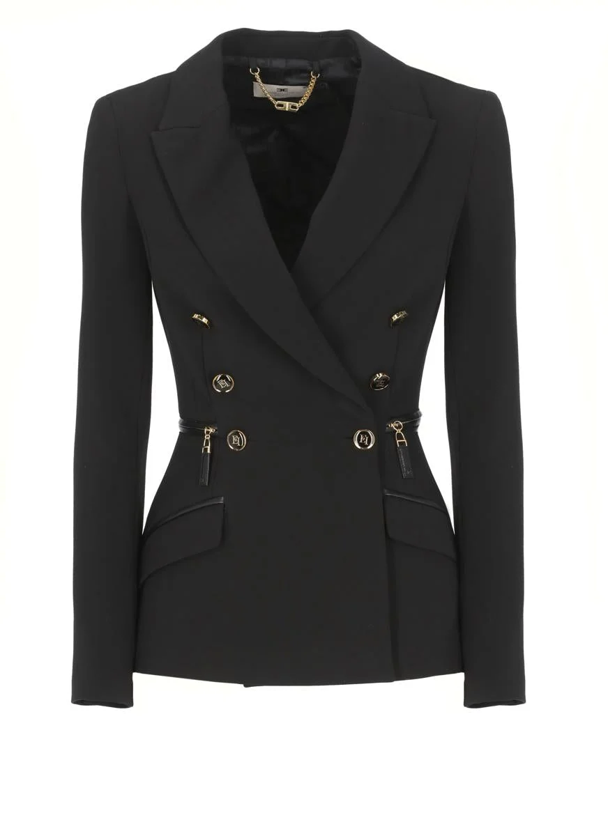 - Black Elisabetta Franchi double-breasted blazer for woman - Peak lapel collar - Long sleeves - Two front zip pockets - Two front flap pockets - Front buttons fastening Model's height is 179 cm and she wears a size 40 Gender: Women Material: 95% POLYESTER 5% ELASTANE INSERTS: 95% VISCOSE 5% ELASTANE COATING: 100% POLYURETHANE LINING: 92% POLYESTER 8% ELASTANE SLEEVE LINING: 97% POLYESTER 3% ELASTANE Color: Black Made in: Italy Product ID: GI17256E2110 *Import tax/duty will be calculated at checkout (If applicable)