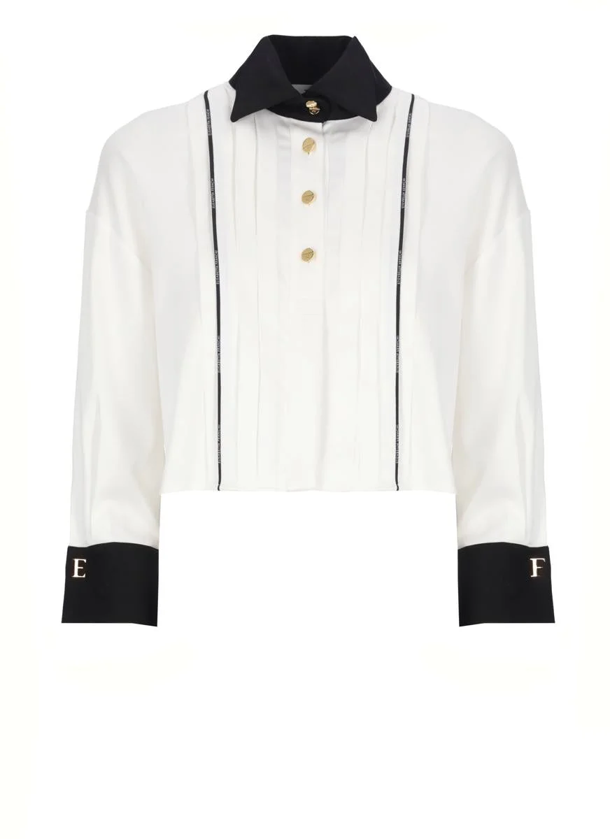 - White Elisabetta Franchi shirt for woman - Contrasting color collar - Long sleeves with contrasting color hem - Front tone on tone embroidered logo - Front buttons fastening Model's height is 179 cm and she wears a size 40 Gender: Women Material: 96% LYOCELL 4% ELASTANE Color: WHITE Made in: Italy Product ID: CA10056E2221 *Import tax/duty will be calculated at checkout (If applicable)
