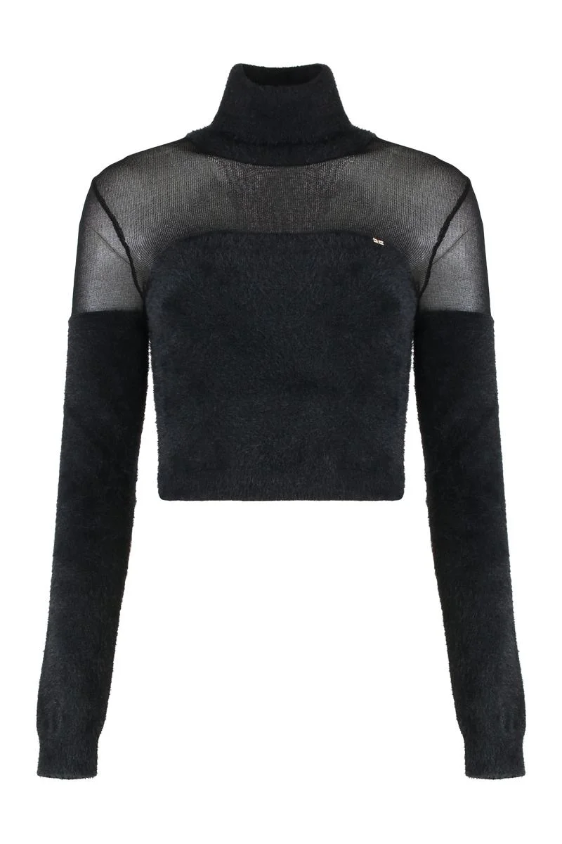 Sweater with logo jewelry Cropped turtleneck sweater with a fitted silhouette. It stands out for the special construction with a fuzzy texture and for the brushed pattern on the shoulders that creates soft plays of transparency. Enhanced by the detail with the logo, highlighted by small rhinestones. Perfect for a casual-chic look or for special occasions. 83% Polyamide, 17% Cotton Gender: Women Material: POLYAMIDE Color: Black Made in: Italy Product ID: MK54T57E2_110 *Import tax/duty will be calculated at checkout (If applicable)