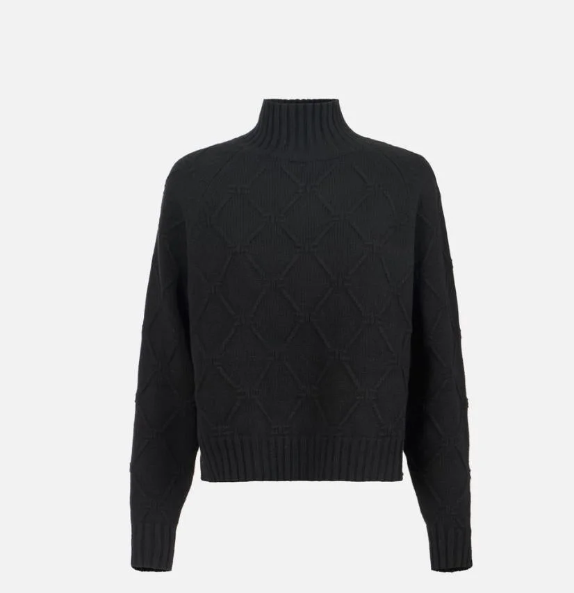 Boxy knit sweater with an oversized fit. It features a high neck, long sleeves, and ribbed edges. It stands out for its jacquard-weave diamond pattern, giving it a three-dimensional, compact feel. A logo label on the back of the neck completes the piece Gender: Women Material: 90%WOOL10%CASHMERE Color: Black Made in: Italy Product ID: MK55T57E2110 Nero *Import tax/duty will be calculated at checkout (If applicable)