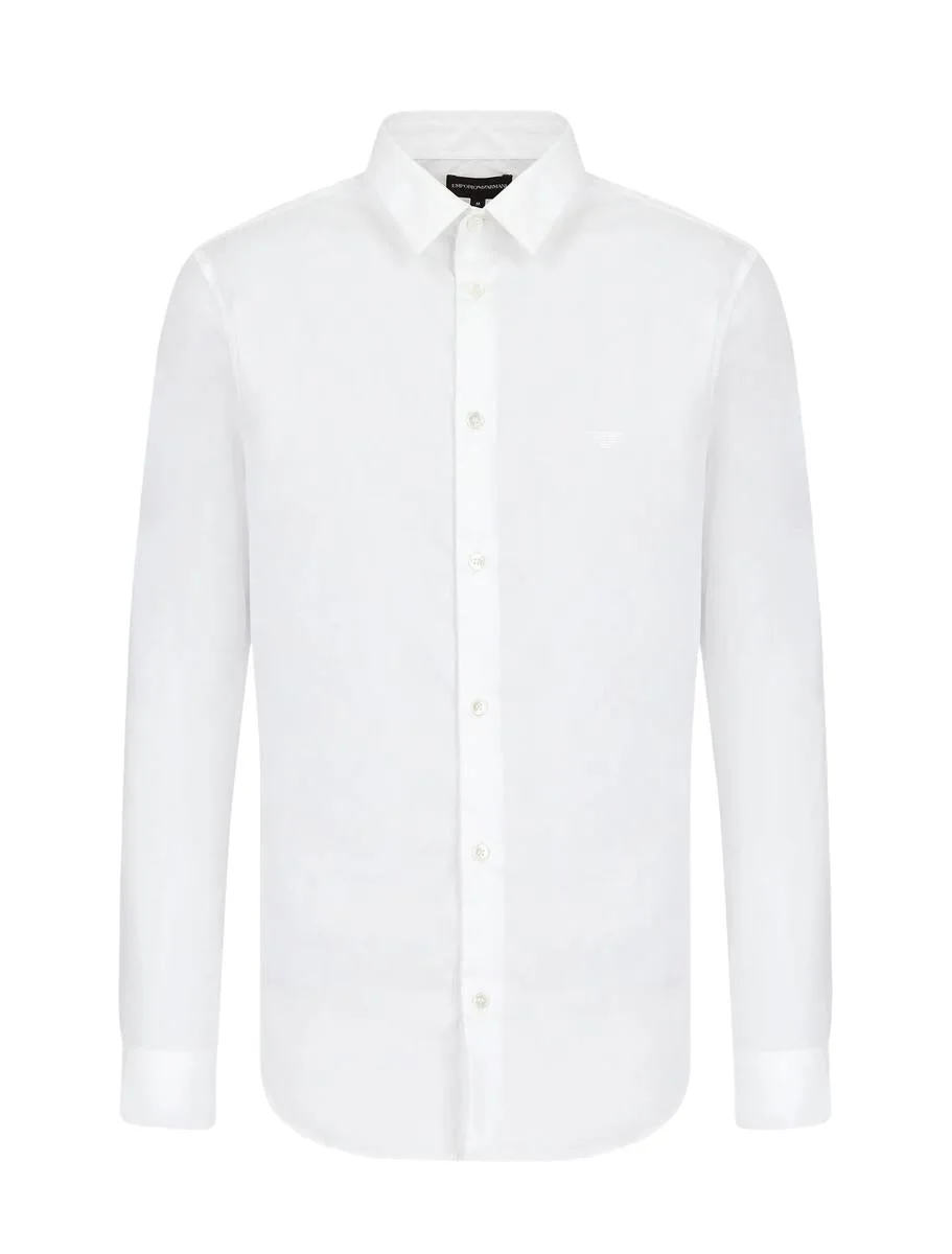 White cotton blend logo-patch longsleeved shirt from EMPORIO ARMANI featuring logo patch at the chest, classic collar, long sleeves and front button fastening Gender: Men Material: COTTON 76% - POLYAMIDE 21% - ELASTANE 3% - Made in: TN Product ID: 8N1C091NI9Z0100 *Import tax/duty will be calculated at checkout (If applicable)