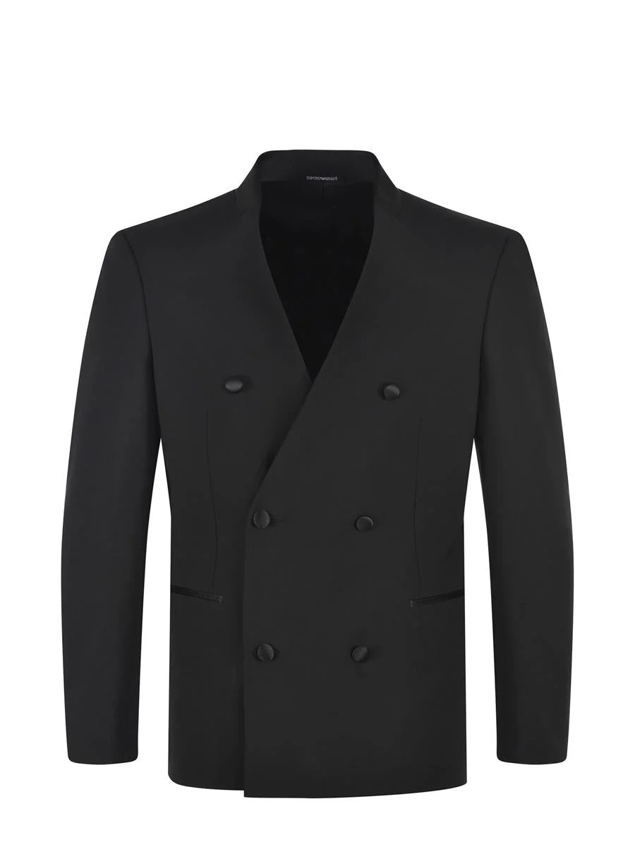 Emporio Armani jacket in black stretch wool. Double-breasted closure with satin buttons. Long sleeves with buttons. Welt pockets with satin profiles. Gender: Men Material: LANA STRETCH Color: Black Made in: IT Product ID: EM000599TE10404-UC001 *Import tax/duty will be calculated at checkout (If applicable)