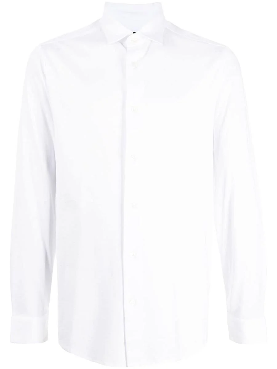 White lyocell-cotton blend jersey long-sleeve shirt from EMPORIO ARMANI featuring spread collar, front button placket, buttoned-cuff sleeves and curved hem. POSITIVELY CONSCIOUS: This Planet Conscious product contains at least 50% eco-materials, which are independently certified as or widely recognised for having a lower environmental impact.. Gender: MEN Material: LYOCELL 70%, COTTON 30% Color: WHITE Made in: IMPORTED Product ID: 8N1CG11JUVZ0100 *Import tax/duty will be calculated at checkout (If applicable)