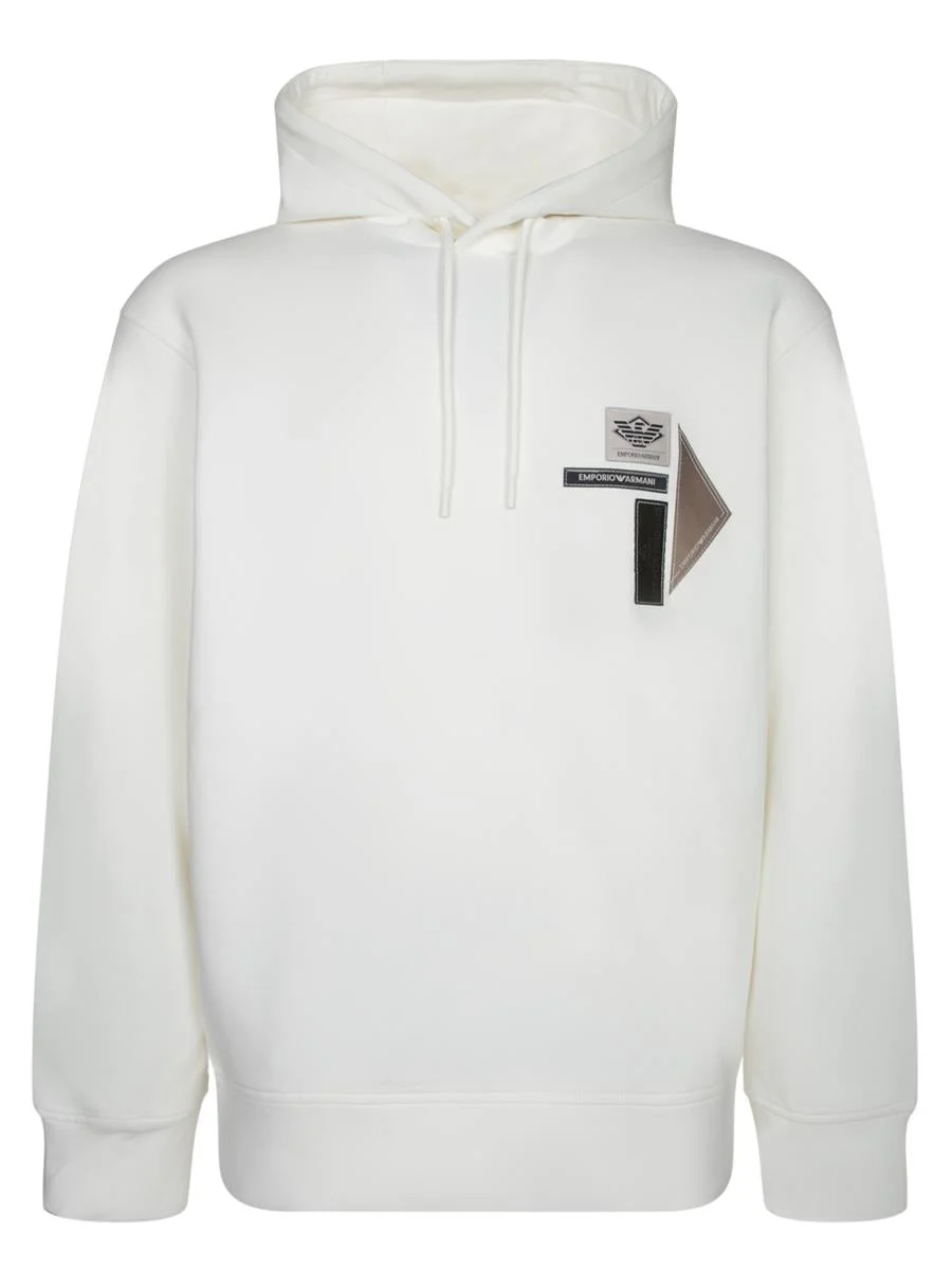 White cotton hoodie featuring a kangaroo front pocket and distinct brand detailing.. This exclusive white hoodie from Emporio Armani blends comfort with style. Equipped with a spacious kangaroo pocket and embellished with iconic brand appliques, it's perfect for a casual yet sophisticated look Gender: Men Material: COTTON 76% POLYESTER 18% ELASTANE 6% Color: WHITE Made in: Imported Product ID: EM003587 AF10013 U0003 *Import tax/duty will be calculated at checkout (If applicable)