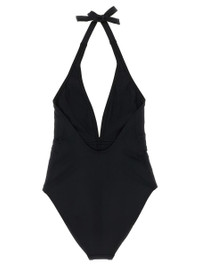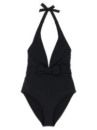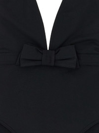 'Couture' one-piece swimsuit in Peau Douce* fabric with deep V-neck on the front, overlapping band at the waist with tone-on-tone bow detail, ties to tie behind the neck, wide round neckline at the back, classic leg Gender: Women Material: 77% POLYAMIDE, 23% ELASTANE Color: Black Made in: Imported Product ID: 012538NOIR *Import tax/duty will be calculated at checkout (If applicable)