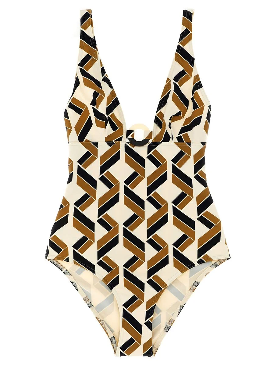 'Party' one-piece swimsuit in Peau Douce fabric with Seventies print, V-neck with two-tone Plexiglas ring detail, wide straps, underbust stitching and breast pincery, classic coverage Gender: Women Material: 77% POLYAMIDE, 23% ELASTANE Color: MULTICOLOR Made in: Imported Product ID: 012541IMPRIMESWIMNOIR *Import tax/duty will be calculated at checkout (If applicable)