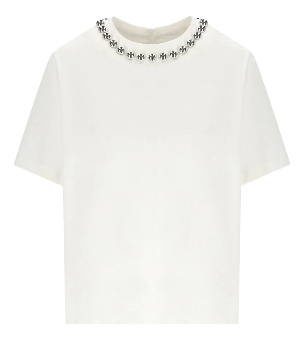 Intenso T-shirt by Essentiel Antwerp made of ivory-colored cotton, embellished with decorative silver spheres around the neckline. Back zip closure. Loose fit. The model is 175 cm tall and wears size M. Composition: 100% cotton. Gender: Women Material: COTTON Color: WHITE Made in: Imported Product ID: INTENSO-OW01 *Import tax/duty will be calculated at checkout (If applicable)