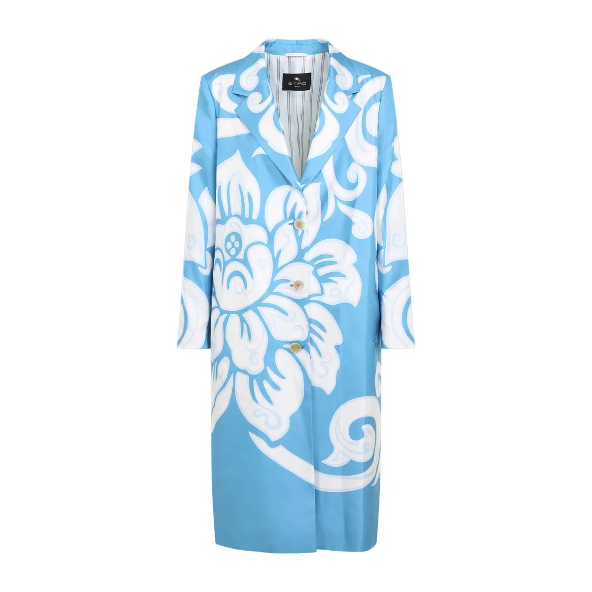 Etro Printed Light Blue Silk Caban. Crafted from light blue silk, signature floral print all over. Notched lapels, front button closure, side pockets. Reinforced shoulders, long sleeves, buttoned cuffs. Back central vent, lined. Gender: Women Material: 100%SILK Color: BLUE Made in: IT Product ID: WRAA067.SP1C5_0888 *Import tax/duty will be calculated at checkout (If applicable)
