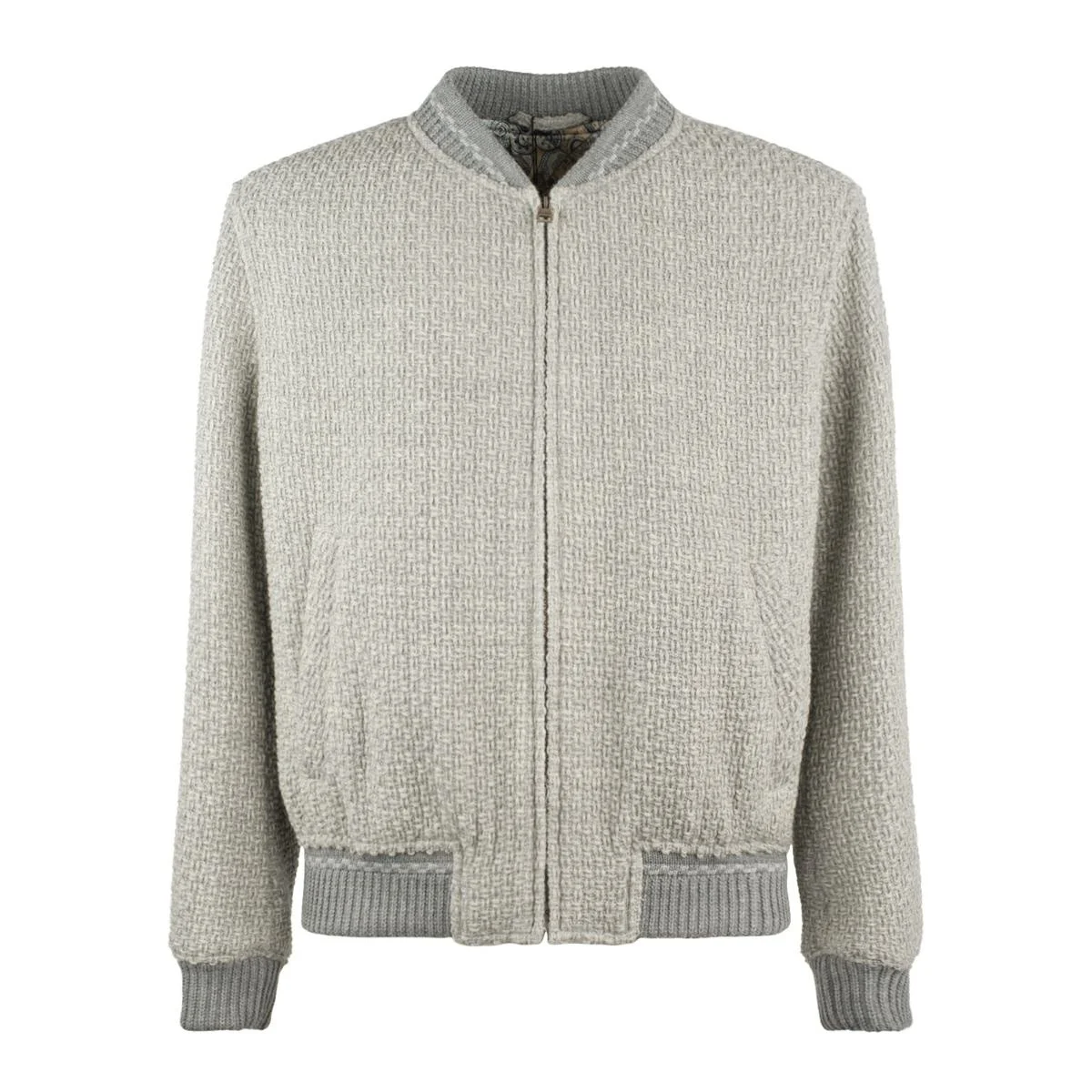 Item Color: Brown | Bomber jacket made of wool with ribbed finished knit edges. The model features an inner lining decorated with a patchwork Paisley pattern print | Regular fit | Zipper closure | Side pockets | Fabric composition: 100% Wool | Sleeves: 52% Viscose, 48% Acetate | Lining: 100% Viscose Gender: Men Material: WOOL Color: GRAY Made in: IT Product ID: MRBA0016 *Import tax/duty will be calculated at checkout (If applicable)