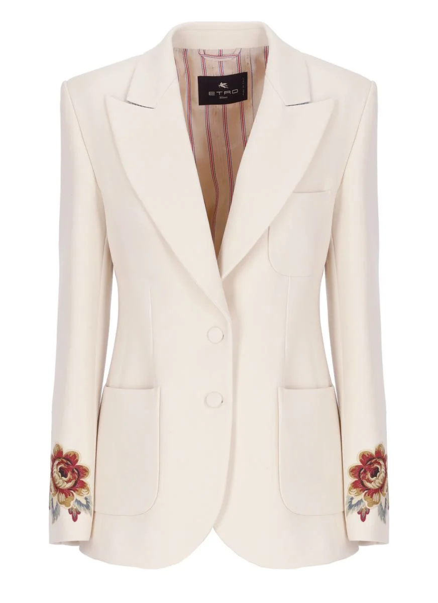 - Ivory Etro wool blend blazer for woman - Peak lapel collar - Long sleeves with buttons and contrasting color embroidery - Front logoed buttons fastening - One breast pocket - Two front welt pockets - One rear vent at hem Model's height is 179 cm and she wears a size 42 Gender: Women Material: 52% POLYESTER 44% WOOL 4% ELASTANE Color: Beige Made in: Italy Product ID: WRCA0009AR365M3791 *Import tax/duty will be calculated at checkout (If applicable)