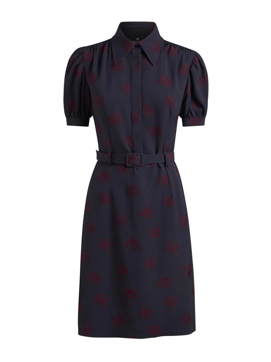 Partial front covered button placket Shirt collar; short puff sleeves; buttoned cuffs Matching adjustable and detachable belt at the waist; belt loops Contrasting all-over jacquard floral pattern Knee-length Regular fit Blue color 79% Acetate, 14% Viscose, 5% Polyester, 2% Elastane Made in Italy Gender: Women Material: 79% ACETATE, 14% VISCOSE, 5% POLYESTER, 2% ELASTANE Color: BLUE Made in: Italy Product ID: WRHA042499TJD92S9883 *Import tax/duty will be calculated at checkout (If applicable)
