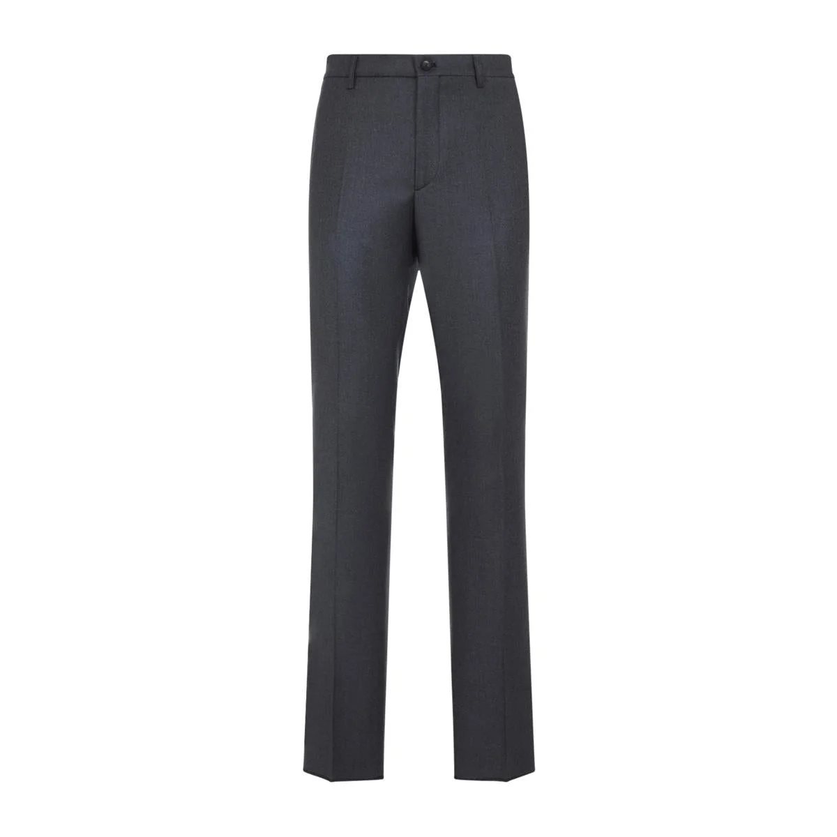 Etro Medium Grey Wool Roma Trousers. Pure medium grey wool trousers, front concealing zipped fastening, front buttoned fastening, belt loops, side pockets, back slit buttoned pockets, straight hem. Gender: Men Material: 100%WOOL Color: GREY Made in: Italy Product ID: MREA0005.99TU2K0_00351 *Import tax/duty will be calculated at checkout (If applicable)