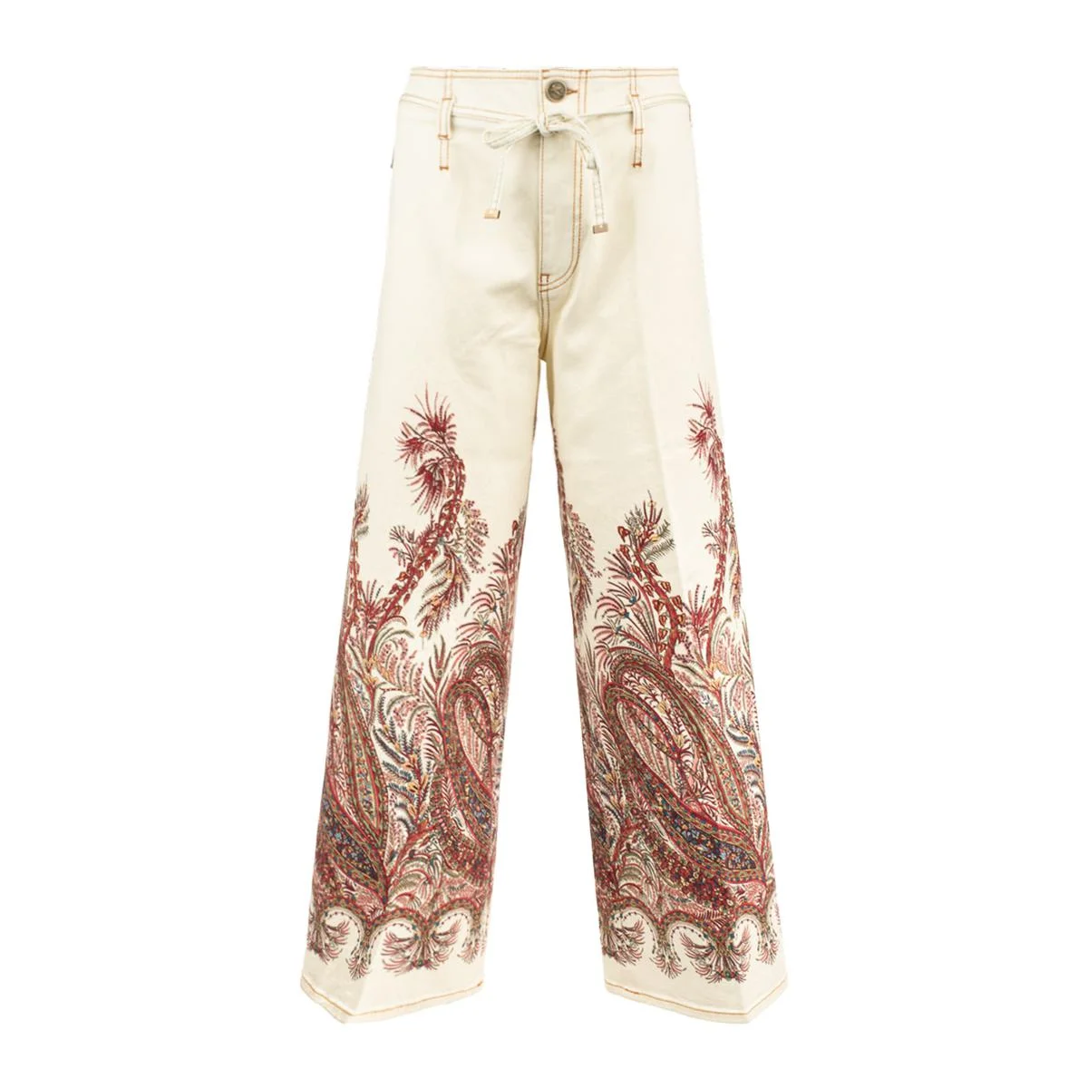 Item Color: Ivory | Made in Italy | Culotte jeans with a leg that widens at the bottom and a high waist with a knotted belt | The model is made of bull denim stretch cotton and features a multicolored Paisley pattern placed print and floral details | Complemented by a metallic button with embossed Pegasus logo | Regular fit | High waist | Patch pockets on the back | Pegasus button and hidden zipper closure | Composition: 97% Cotton, 3% Elastane Gender: Women Material: COTTON, SYNTHETICS Color: WHITE Made in: Italy Product ID: WRNB0006AKA31X0801 *Import tax/duty will be calculated at checkout (If applicable)