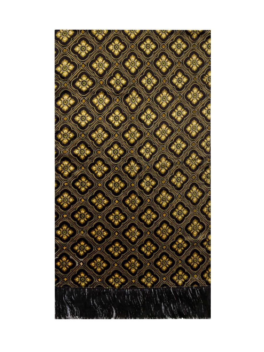 Black and gold scarf. Transparent inserts. Bangs at the bottom. 75 x 210 cm Gender: Women Material: OUTSIDE: 82% VISCOSE, 18% SILK - 100% ACETATE Color: Black Made in: IT Product ID: 1D0309549 0001 *Import tax/duty will be calculated at checkout (If applicable)
