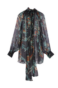 Etro blouse crafted from black silk organza with an all-over daffodil print. Featuring a high collar with integrated scarf, back button closure, long raglan sleeves with buttoned cuffs, and a rounded hem. Gender: Women Material: .: 100% SILK Color: BLACK BACKGROUND PRINTING Made in: Italy Product ID: WRJA015099SA1M0X0813 *Import tax/duty will be calculated at checkout (If applicable)