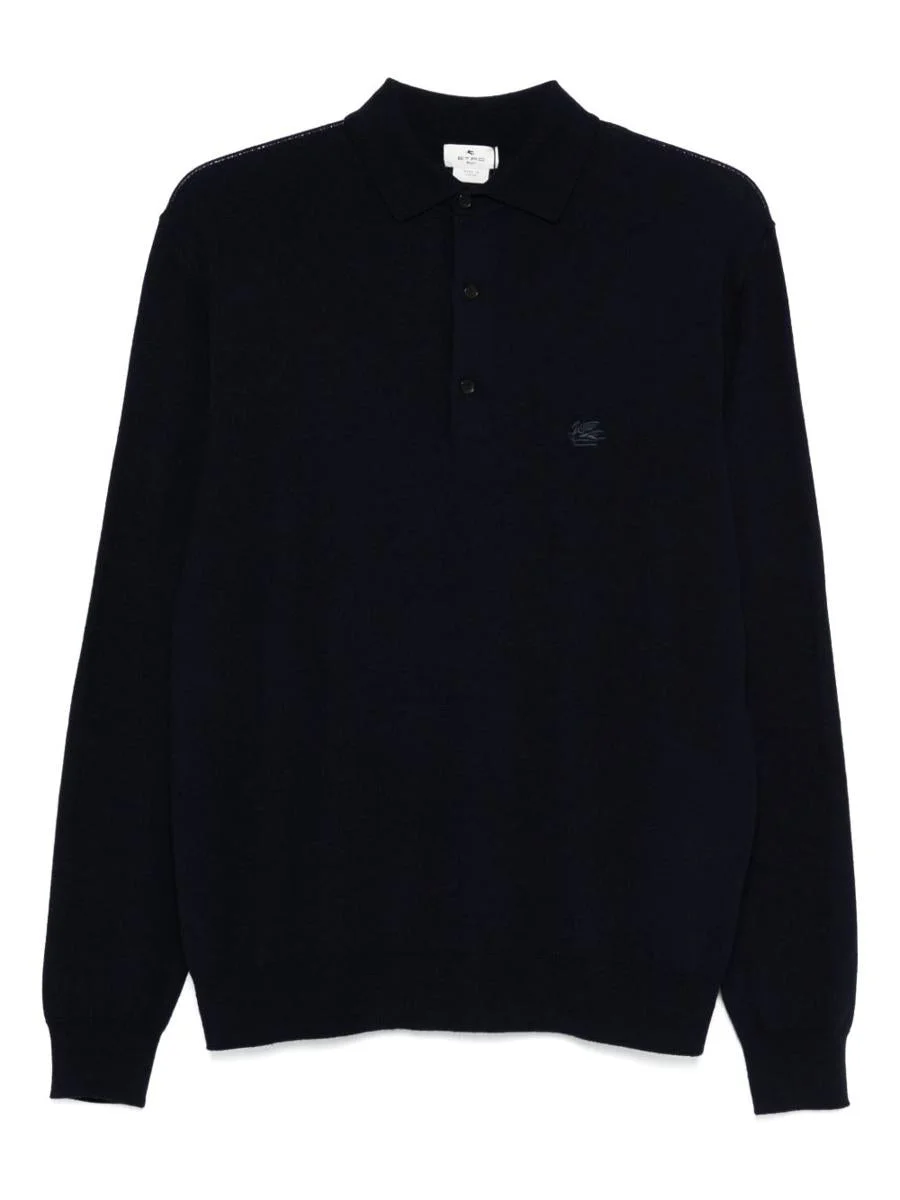 Front three-button placket Ribbed polo collar; long sleeves Embroidered tone-on-toned ETRO and Pegaso logo at chest Ribbed cuffs and bottom band Regular fit Blue color 100% Wool Made in China Gender: Men Material: 100% WOOL Color: BLUE Made in: Imported Product ID: MRKF0028AL291B0665 *Import tax/duty will be calculated at checkout (If applicable)