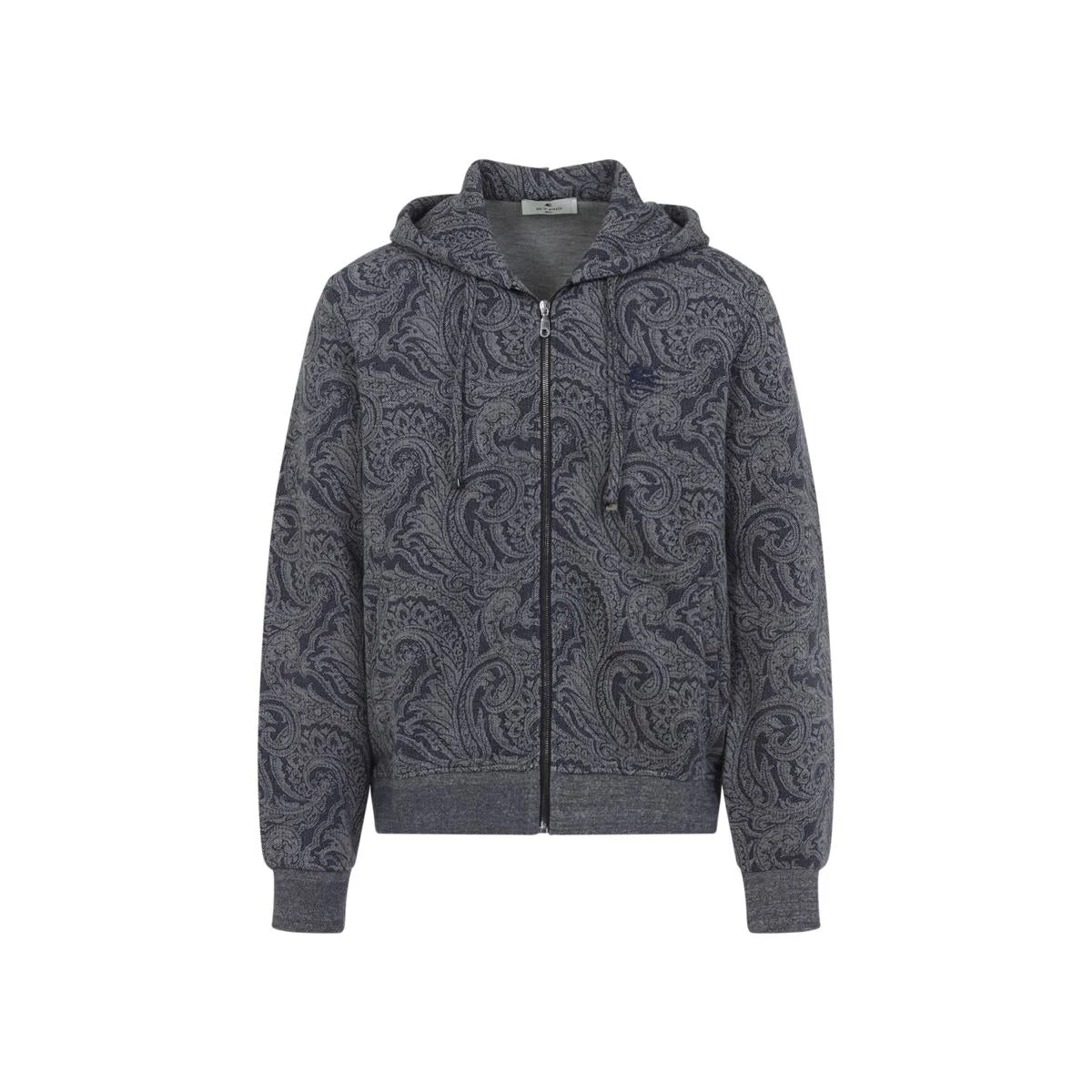 Etro Blue Zipped Hoodie With Welt Pockets. Crafted in viscose and polyamide blend, tonal hood, front drawstring detail, front zipped fastening, side pockets, long sleeves, ribbed cuffs and hem, straight hem. Blue and grey paisley design all-over. Gender: Men Material: 88%VISCOSE 12%POLYAMIDE Color: BLUE Made in: Italy Product ID: MRMB0025.99JJ508_8460 *Import tax/duty will be calculated at checkout (If applicable)