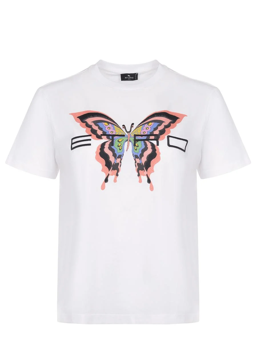Etro t-shirt made of white cotton. Ribbed crew neck. Short sleeves. Front with contrasting print featuring an embossed embroidered logo. Gender: Women Material: 100% COTTON Color: WHITE Made in: Italy Product ID: WRMA0006AK786-W0111 *Import tax/duty will be calculated at checkout (If applicable)