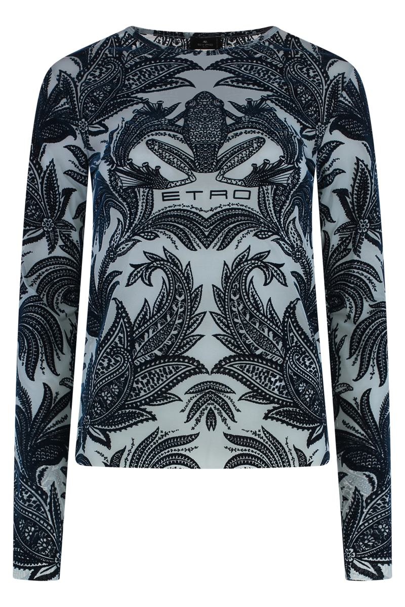 Tulle top Velvet effect print 93% Polyamide, 7% Elastane, 100% Nylon Gender: Women Material: NYLON Color: BLUE Made in: IT Product ID: WRJA0038AK801_S9001 *Import tax/duty will be calculated at checkout (If applicable)