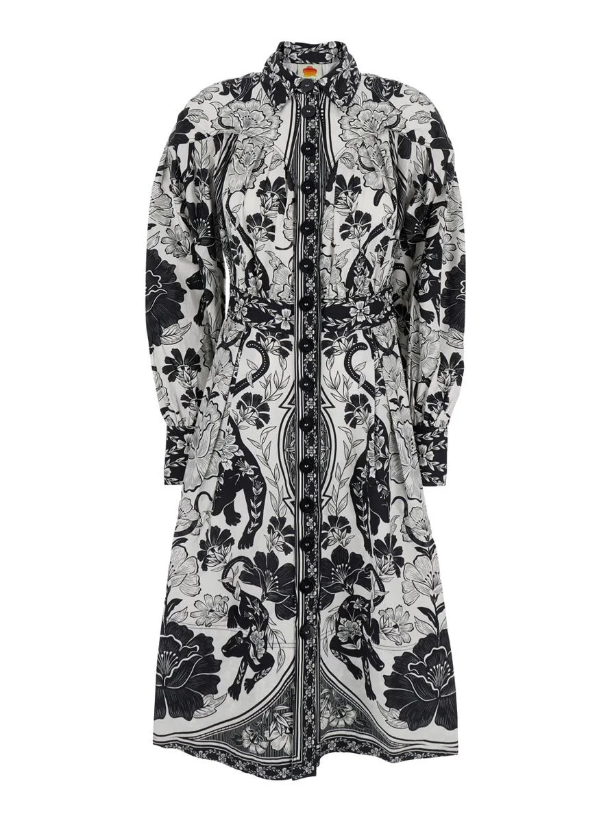 Farm Rio Black And White Long Dress With High Neck And All-Over Floral Print In Cotton Woman
