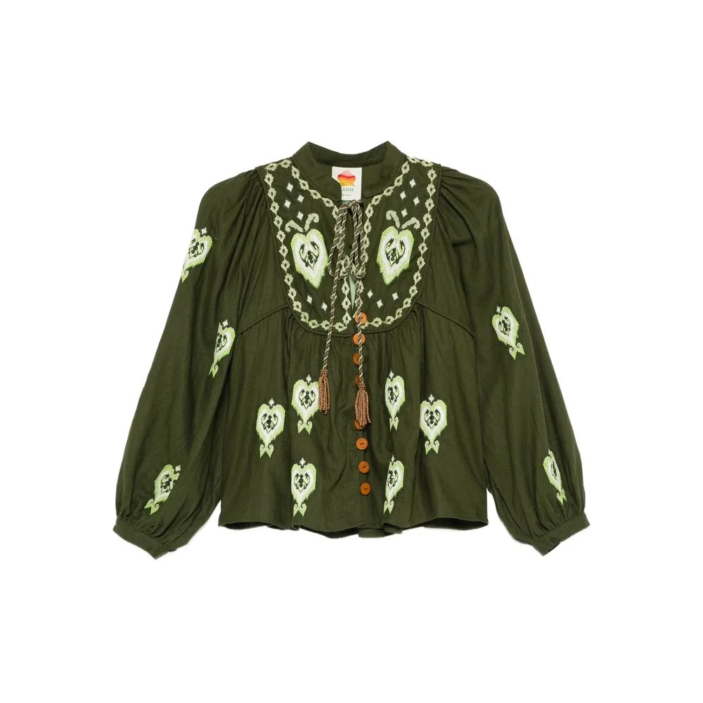 Green Embroidered Puff Sleeve Lenzing™ Ecovero™ Euroflax™ Blouse