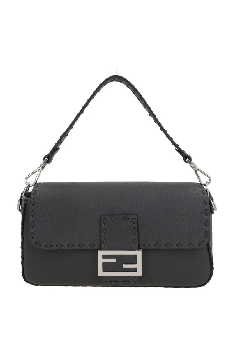 Fendi shoulder bag made of dark grey grained leather with tone-on-tone stitching. Featuring silver-tone hardware, magnetic button closure on the flap, removable handle, and removable shoulder strap. The brown suede-effect fabric-lined interior includes a zippered pocket. The design is completed by the FF detail on the flap. Gender: Men Material: 100%VIT+INTERNAL:90%POLYESTER,10%POLYURETHANE Color: ASPHALT+PALLADIUM Made in: Italy Product ID: 7VA572ARLZF0J55 *Import tax/duty will be calculated at checkout (If applicable)