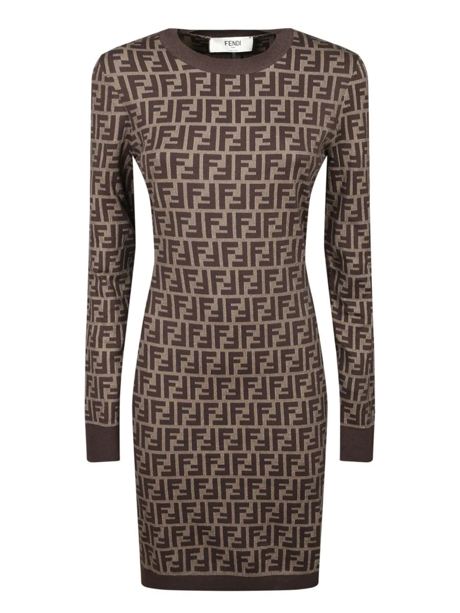 Long sleeve dress. Fitted model. Crew neck.. Elegance and sophistication merge in this Fendi dress with the iconic FF pattern. A fitted design that enhances the silhouette, made from stretch fabric for uncompromised comfort Gender: Women Color: BROWN Made in: Imported Product ID: FZDC83 ASJT F0GGE *Import tax/duty will be calculated at checkout (If applicable)