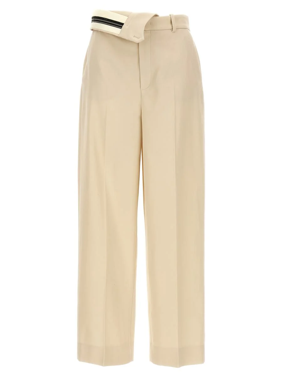 Wool and cotton gabardine trousers, zip and hook closure, asymmetrical waist with 'Fendi Roma' logo tape, ironed crease, pockets Gender: Women Material: 62% WOOL, 38% COTTON Color: Beige Made in: IT Product ID: FR6540ARU5F1NY8 *Import tax/duty will be calculated at checkout (If applicable)