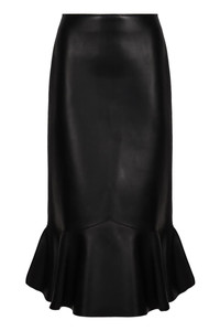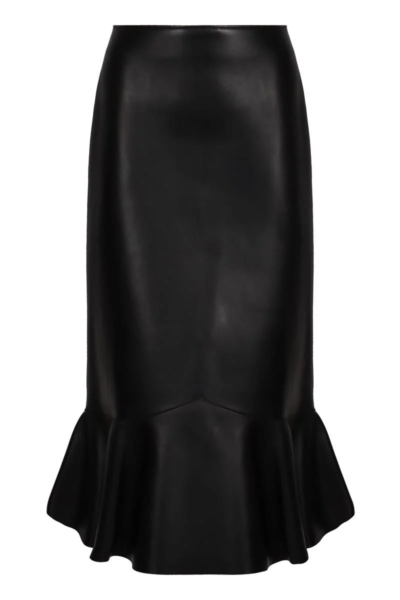 Gonna in black napa leather Gonna long skirt high waist made of soft smooth black nappa leather. Characterized by an elegant design with peplum detail at the bottom. Features a zip closure at the back and two side pockets. 100% Lamb, 100% Viscose Gender: Women Material: LAMB Color: Black Made in: Italy Product ID: FPD970AUV3_F0GME *Import tax/duty will be calculated at checkout (If applicable)