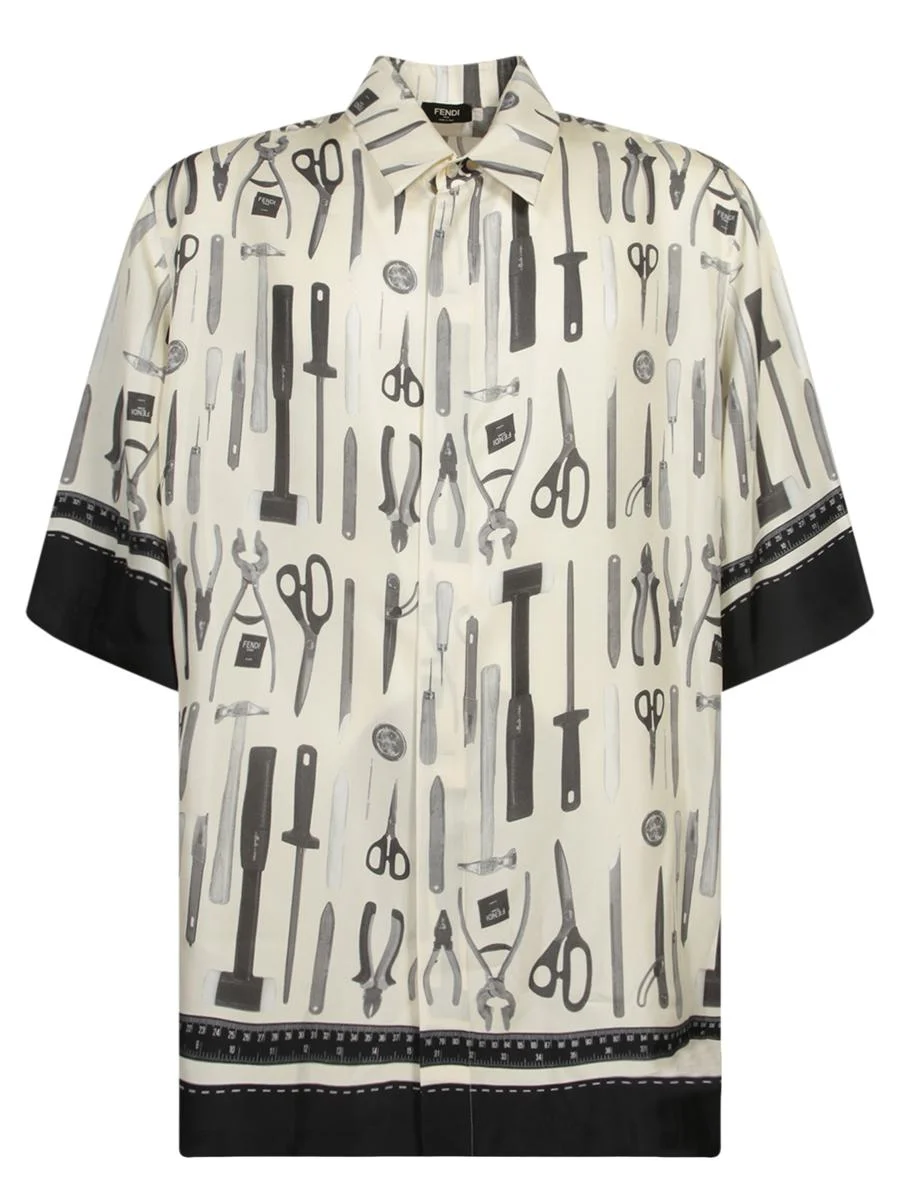 Short sleeves. All-over tool print. Pointed collar.. Showcase a bold look with this luxurious silk shirt by FENDI, featuring an eclectic tool print on a white base with black detailing Gender: Men Color: WHITE Made in: Imported Product ID: FS0966 AR65 F1MTG *Import tax/duty will be calculated at checkout (If applicable)