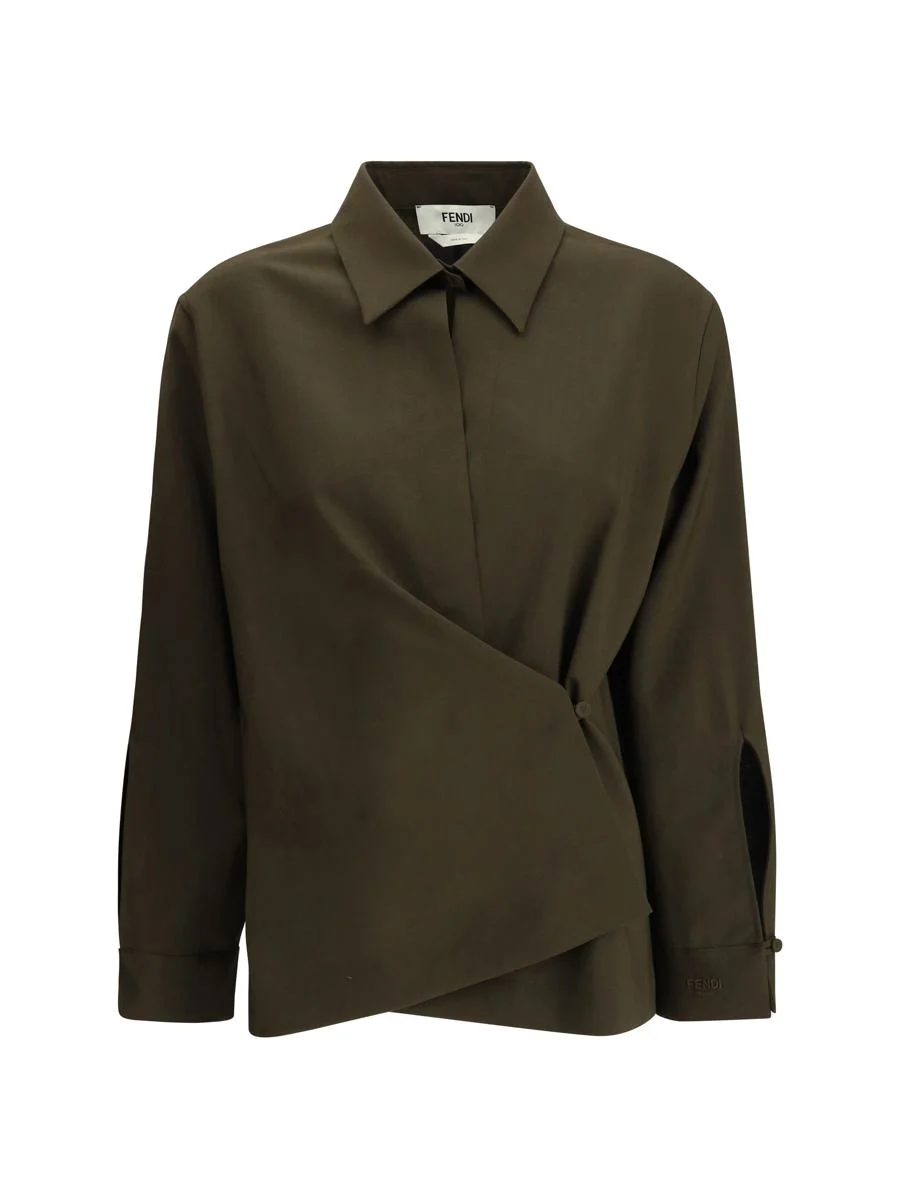 THE FENDI WOOL AND MOHAIR SHIRT PLAYS WITH PROPORTIONS AND TAILORED DETAILS TO CREATE A GARMENT WITH CHARACTER. THE CRISSCROSS SILHOUETTE IS DEFINED BY AN ASYMMETRICAL SMALL SIDE BUTTON CLOSURE THAT GENERATES AN ELEGANT DRAPED PATTERN AT THE HIP AND A REFINED CUT-OUT DETAIL AT THE NECKLINE. THE CLASSIC COLLAR AND HIGH BUTTON CUFFS ENHANCE THE TAILORED CONSTRUCTION, WHILE TONE-ON-TONE FENDI ROMA EMBROIDERY ON THE LEFT CUFF ADDS A DISCREET YET UNMISTAKABLE SIGNATURE. A GARMENT THAT COMBINES FEMININITY, MODERNITY AND THE MAISON'S CRAFTSMANSHIP. RTW IT Gender: Women Material: MOHAIR | WOOL | SILK Color: GREEN Made in: Imported Product ID: FS8287AQ3H_F1T6G *Import tax/duty will be calculated at checkout (If applicable)