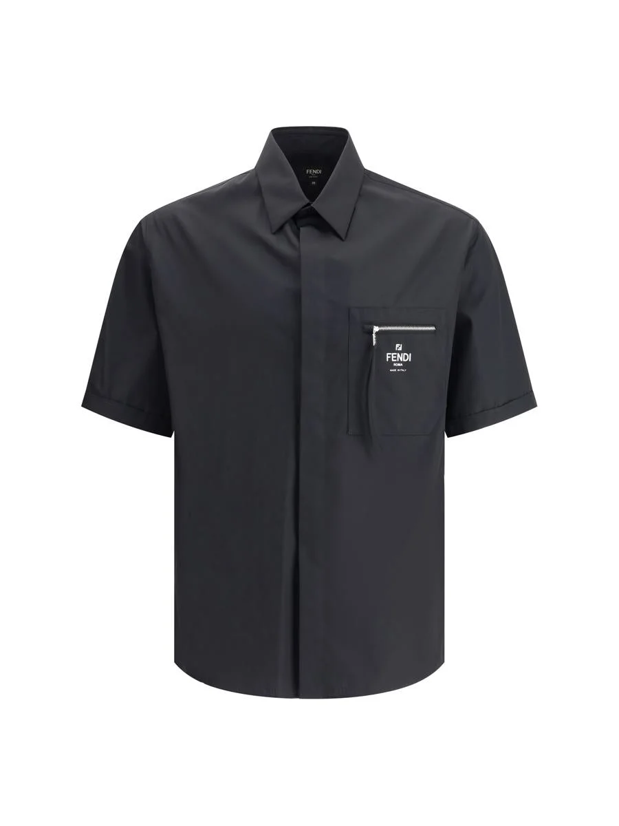 FENDI'S COTTON SHIRT IS A SUMMER PIECE WITH A CLEAN AND REFINED DESIGN. FEATURING A CLASSIC COLLAR AND SHORT SLEEVES, IT FEATURES A FRONT CLOSURE WITH CONCEALED BUTTONS FOR A MINIMALIST EFFECT. A ZIPPERED PATCH POCKET STANDS OUT ON THE FRONT, ENHANCED BY THE BRAND'S ICONIC CONTRASTING SIGNATURE ON THE BREAST POCKET, WHICH ADDS A DISTINCTIVE AND MODERN TOUCH. PERFECT FOR CASUAL-CHIC LOOKS. SHIRT CM Gender: Men Material: COTTON Color: Black Made in: Italy Product ID: FS1097AN08_F0QA1 *Import tax/duty will be calculated at checkout (If applicable)