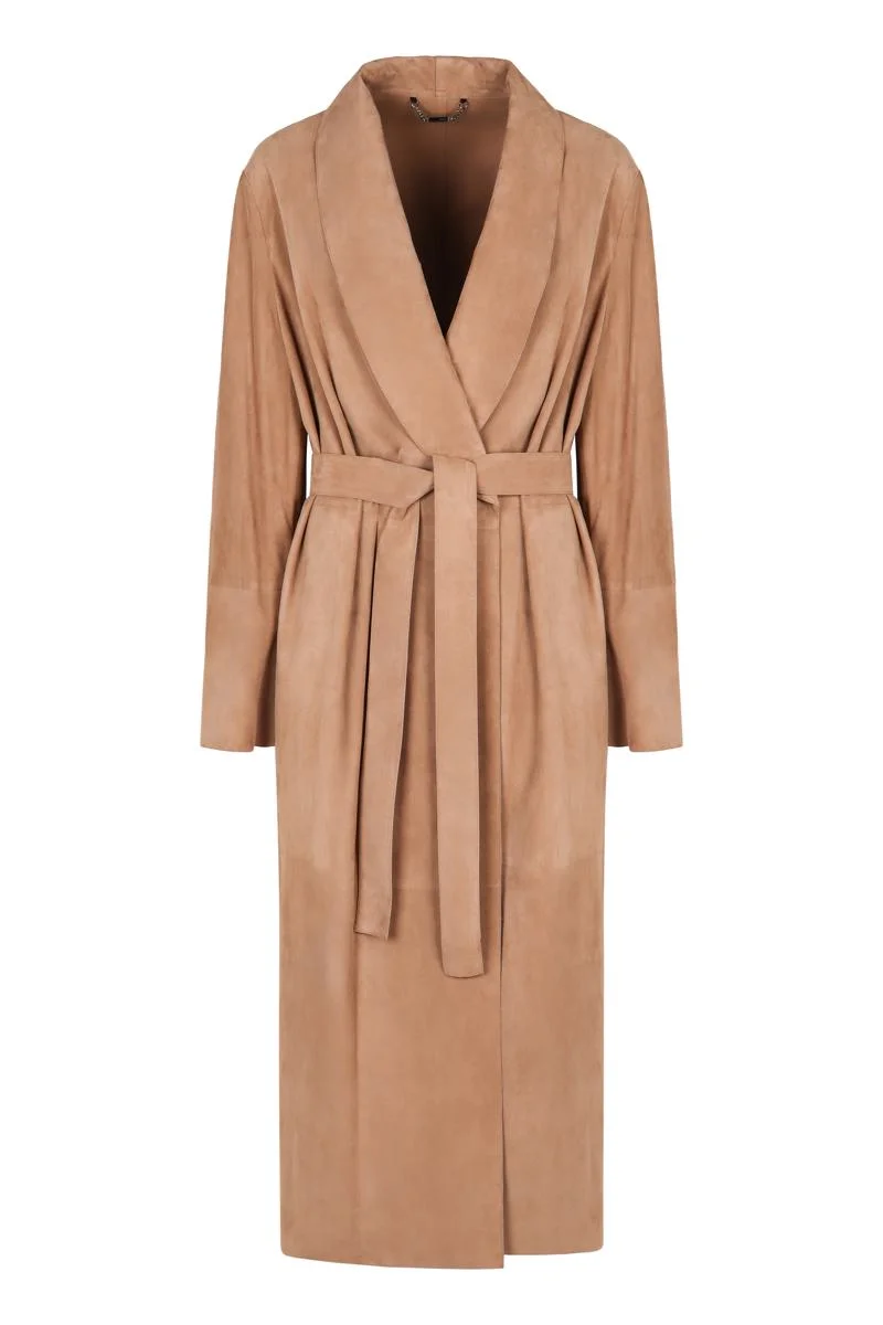 Suede coat Suede calfskin item Shawl collar Coordinated waist belt 100% Calf Gender: Women Material: CALF Color: Beige Made in: Italy Product ID: FPS901AUON_F1SA0 *Import tax/duty will be calculated at checkout (If applicable)