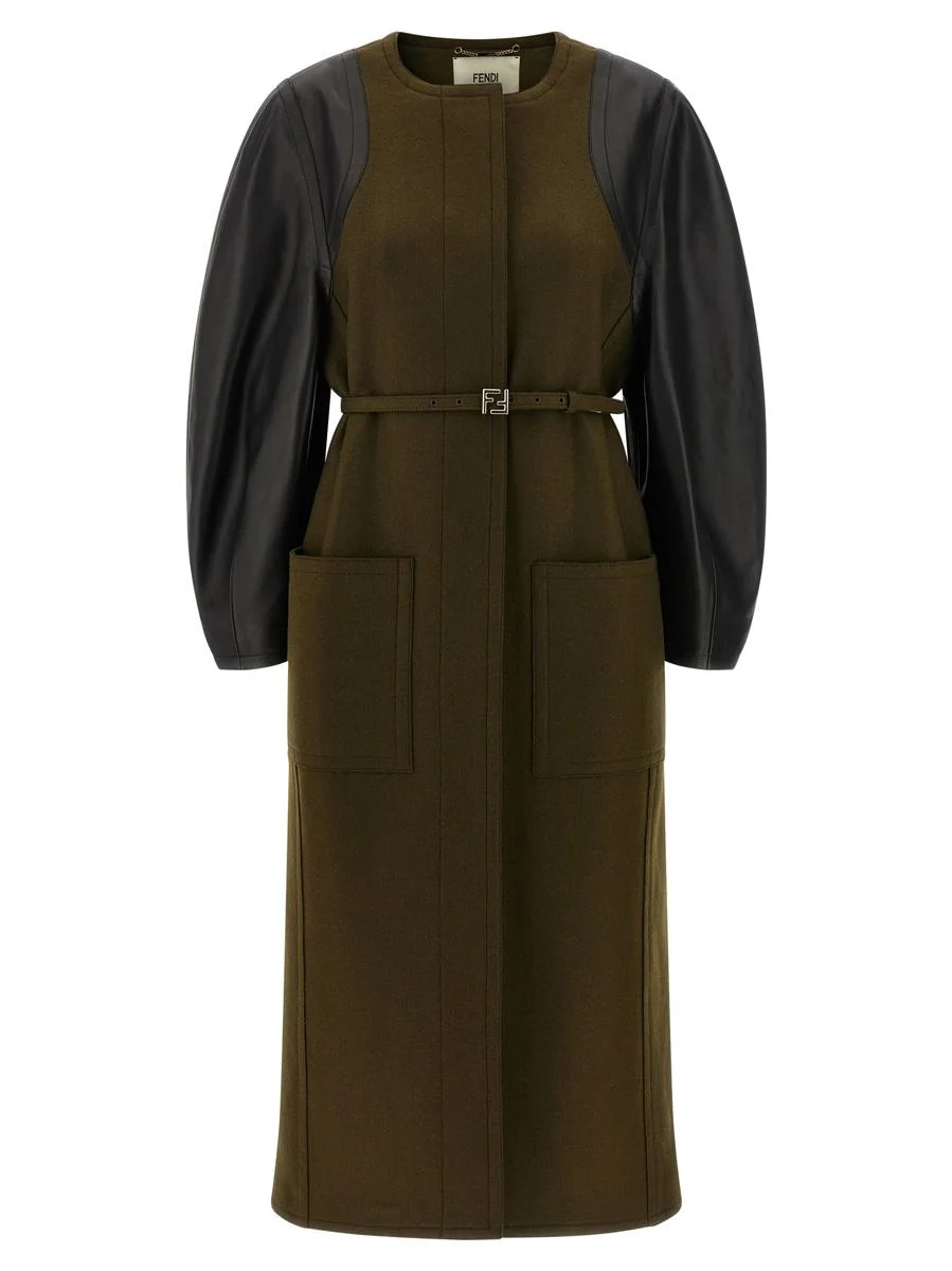 Wool Felt' wool crewneck coat with concealed front button closure, long leather sleeves, side pockets, mini belt at the waist with adjustable and removable logo Gender: Women Material: 100% VISCOSE Color: GREEN Made in: Italy Product ID: FF6150AJ0KF1T6G *Import tax/duty will be calculated at checkout (If applicable)