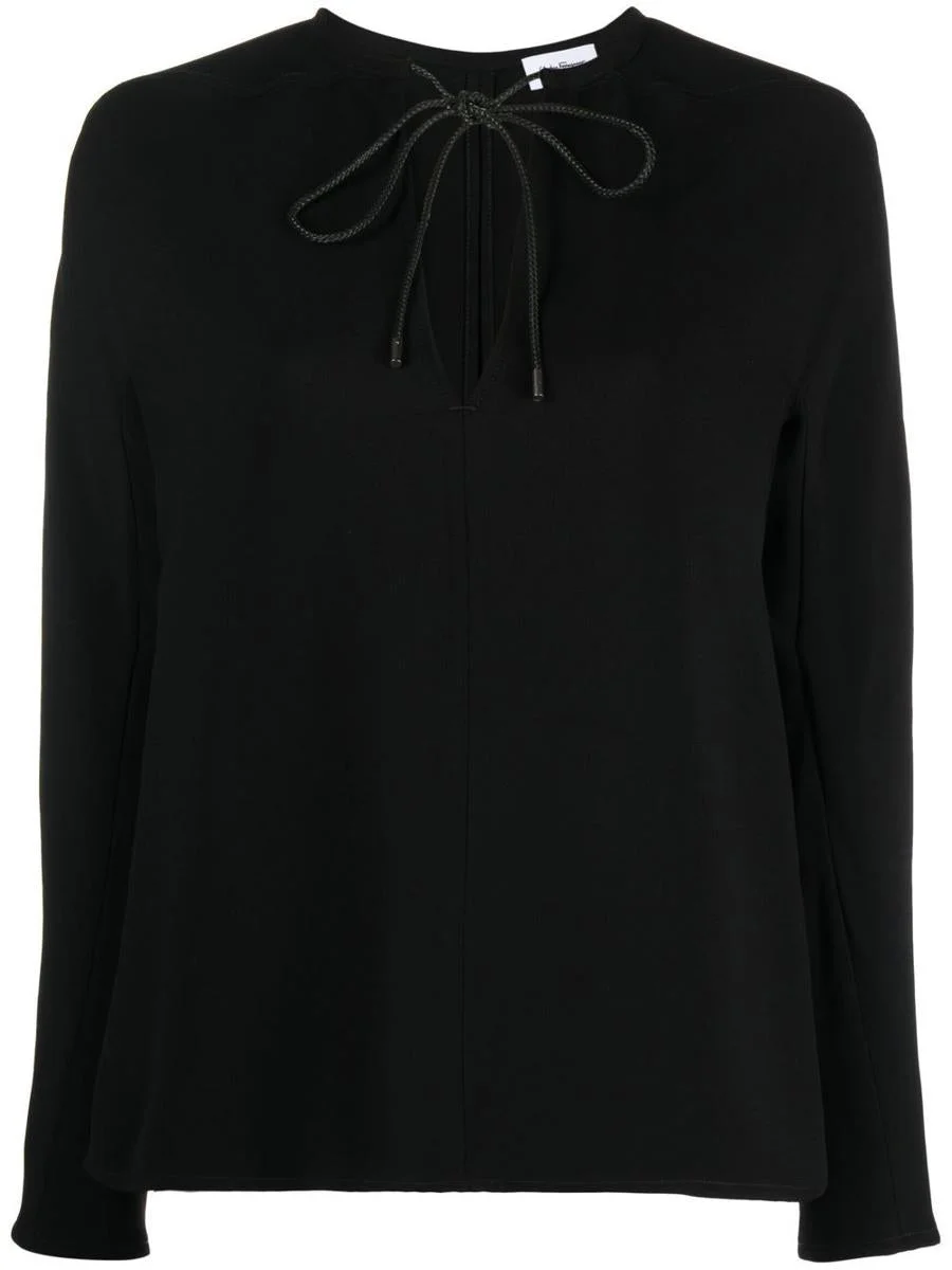 tie-neck long-sleeve blouse from Ferragamo featuring black, calf leather, gathered tie neck, round neck, long sleeves and straight hem. Gender: Women Material: RAYON 100% Color: BLACK Made in: IT Product ID: 758652 002 *Import tax/duty will be calculated at checkout (If applicable)