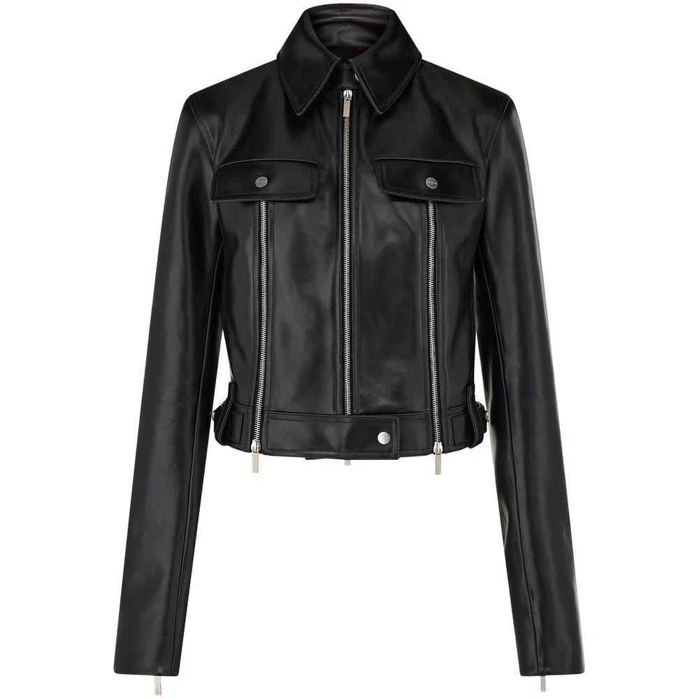 Black calf leather two-way zip fastening front press-stud fastening straight-point collar chest flap pockets decorative zip detailing long sleeves cuff zips straight hem Gender: Women Material: OUTER COMPOSITION CALFSKIN: 100.0% Color: Black Made in: IT Product ID: 13G461 0781501 NEARG *Import tax/duty will be calculated at checkout (If applicable)